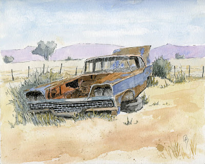 | "Abandoned 1959 Ford Fairlane" pen and watercolor, 8" x 10" |